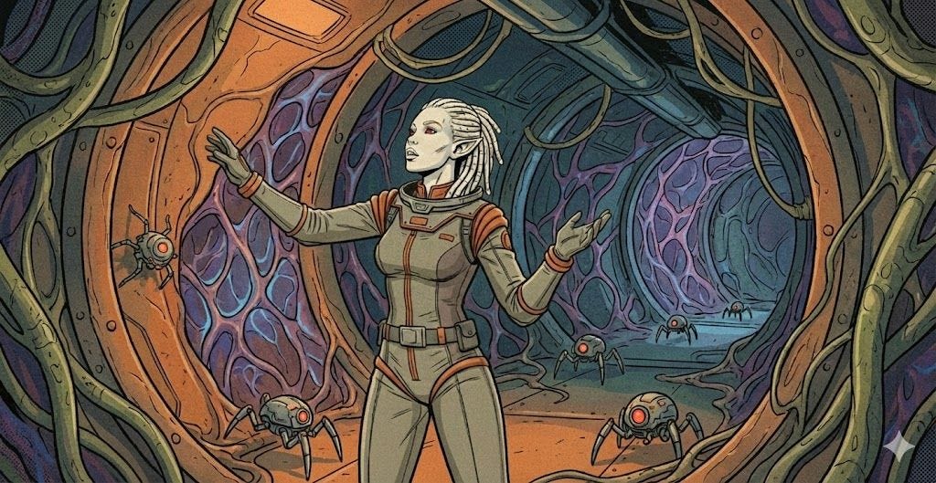 Catching a glimpse of the little bot skittering along, Noel smirks, “I wonder where he intends to lead me.” Glancing around, another large scar in the vessel’s side wall made her shudder. “If it’s started punching through the netting over its metal frame...that’s not good; she could collapse in on herself.” The alien glanced around, glancing at her tracker once more.